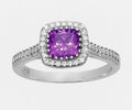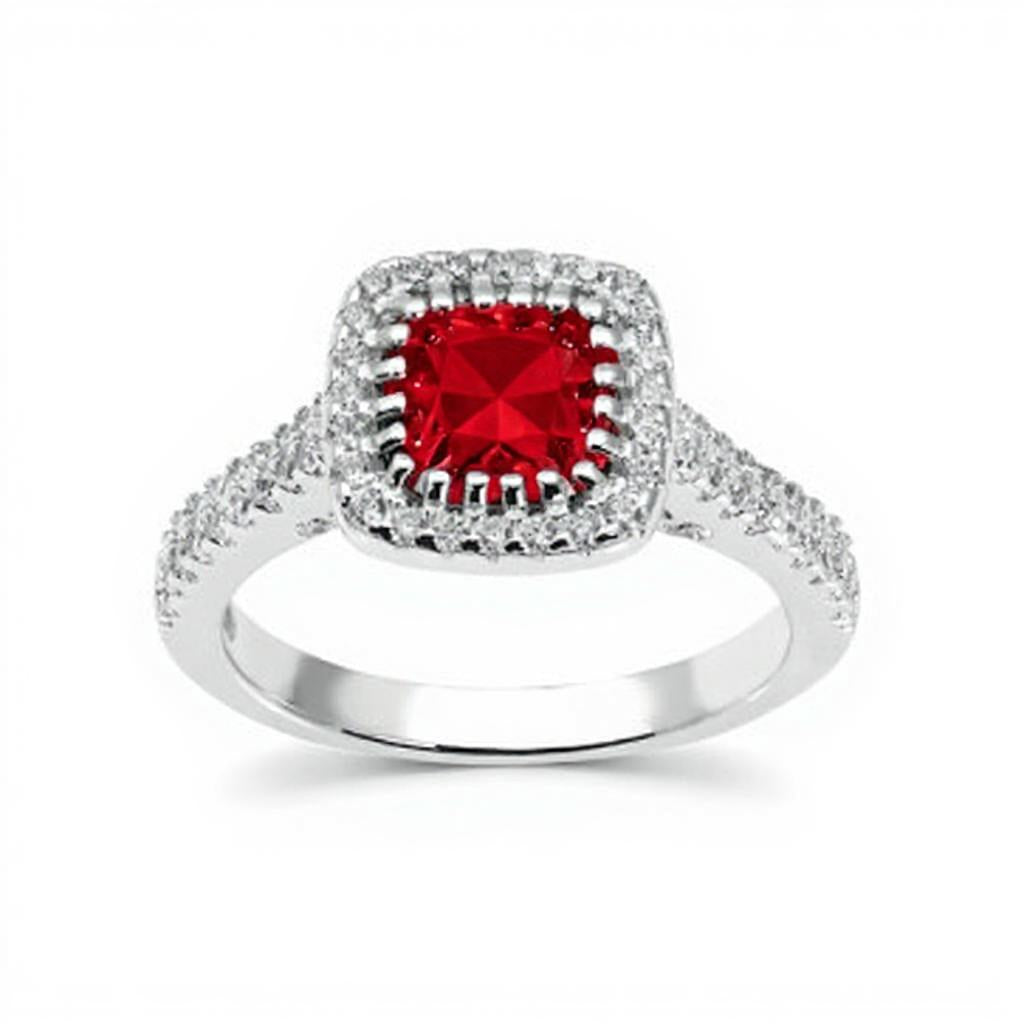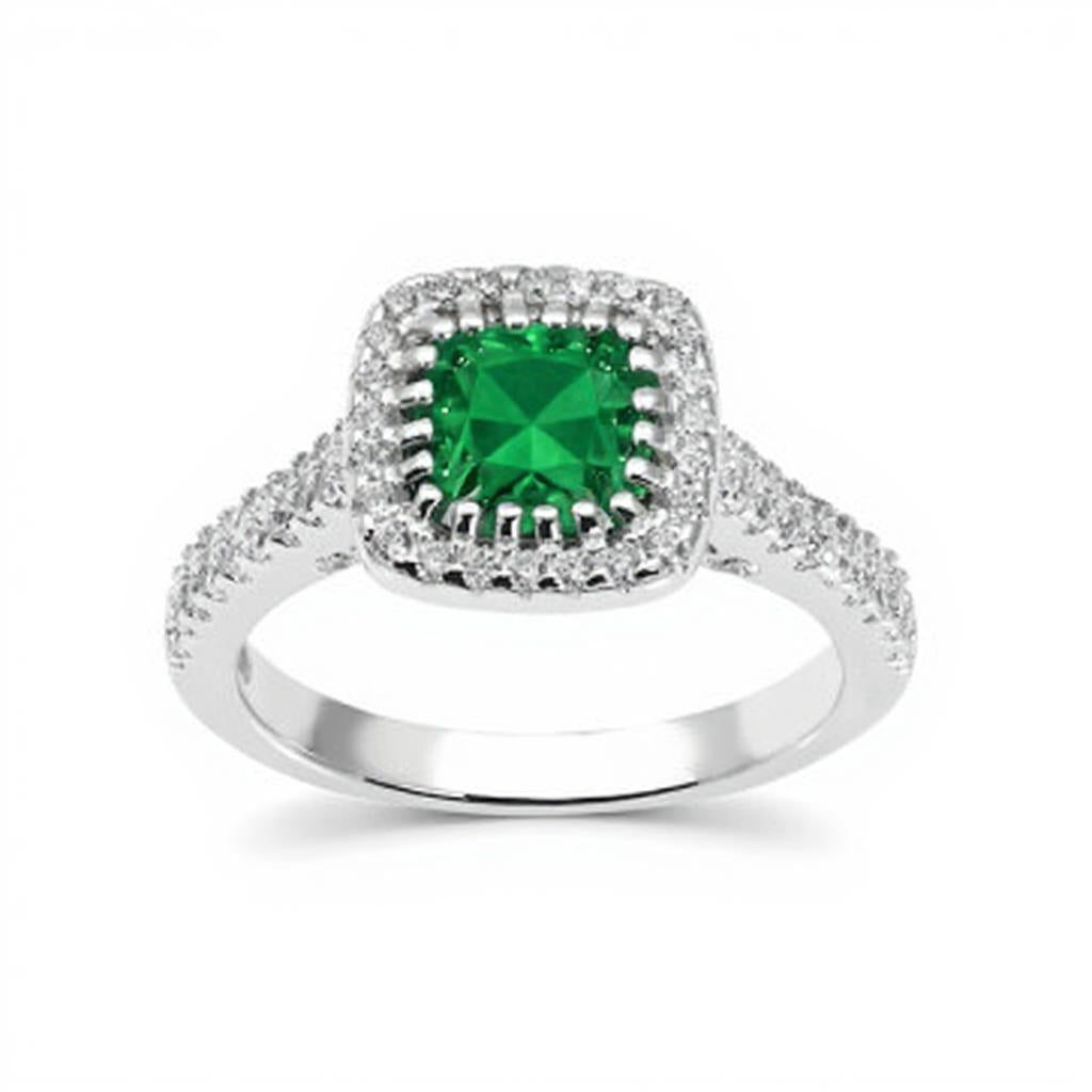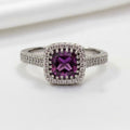6.4x6.4mm cushion cut with cubic zirconia halo set in sterling silver.